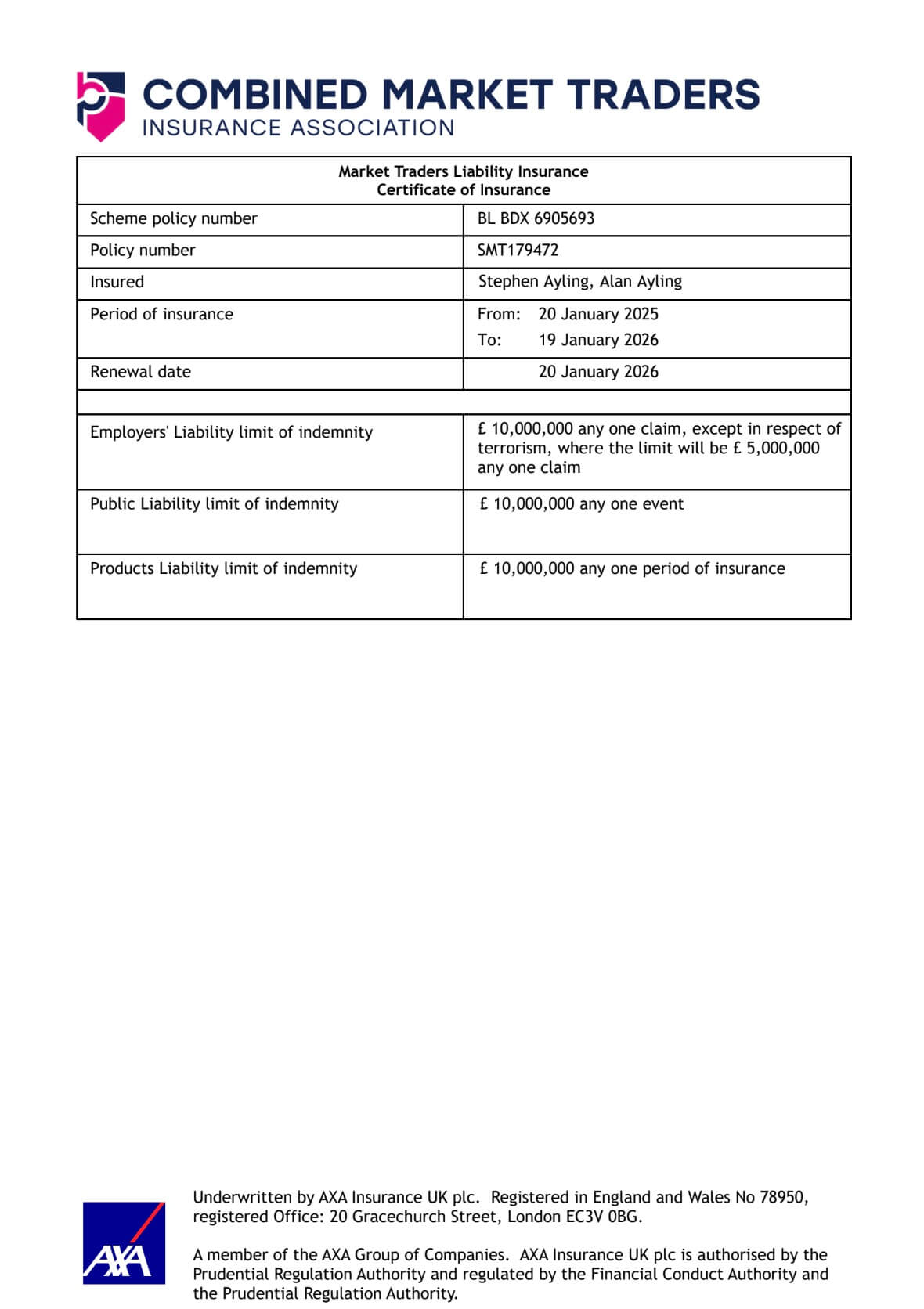 Here you can view or download a copy of our Public Liability Insurance certificate (£10m)